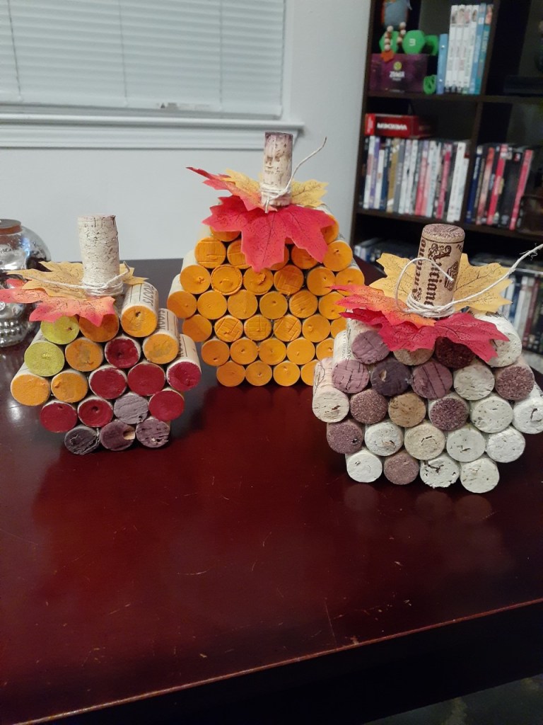 Materials: wine corks, hot glue gun, fake fall leaves, twine, and paint