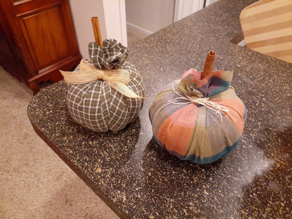 Materials: foam pumpkins, flannel shirts, twine, cinnamon sticks, and scissors